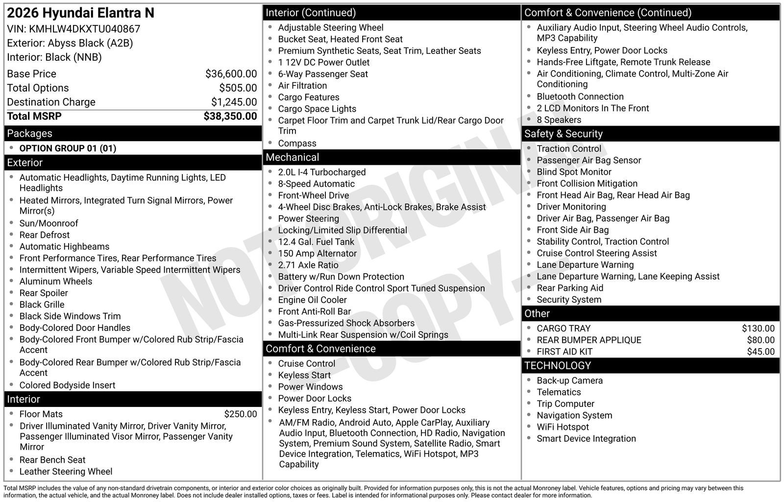 $1,138 off MSRP! With options like Option Group 01, 4-Wheel Disc Brakes, 8 Speakers, ABS brakes, Air Conditioning, All Season Fitted Liners, Alloy wheels, AM/FM radio: SiriusXM, Apple CarPlay & Android Auto, Auto High-beam Headlights, Automatic temperature control, Brake assist, Bumpers: body-color, Cargo Tray, Compass, Delay-off headlights, Driver door bin, Driver vanity mirror, Dual front impact airbags, Dual front side impact airbags, Electronic Stability Control, Emergency communication system: None, Exterior Parking Camera Rear, First Aid Kit, Four wheel independent suspension, Front anti-roll bar, Front Bucket Seats, Front Center Armrest w/Storage, Front dual zone A/C, Front reading lights, Fully automatic headlights, Heated door mirrors, Heated front seats, Illuminated entry, Leather Shift Knob, Leather steering wheel, Leather/Alcantara Seat Trim, Low tire pressure warning, N Light Heated Sport Bucket Seats, Navigation System, Occupant sensing airbag, Outside temperature display, Overhead airbag, Overhead console, Panic alarm, Passenger door bin, Passenger vanity mirror, Power door mirrors, Power steering, Power windows, Radio: Bose AM/FM/HD/SXM Audio System, Rear Bumper Applique, Rear side impact airbag, Rear window defroster, Remote keyless entry, Security system, Speed control, Speed-sensing steering, Spoiler, Steering wheel mounted audio controls, Tachometer, Telescoping steering wheel, Tilt steering wheel, Traction control, Trip computer, Turn signal indicator mirrors, Variably intermittent wipers, and Wheels: 19 x 8.0 Forged Alloy. Abyss Black 2026 Hyundai Elantra N FWD 8-Speed Automatic 2.0L 4-Cylinder Turbocharged