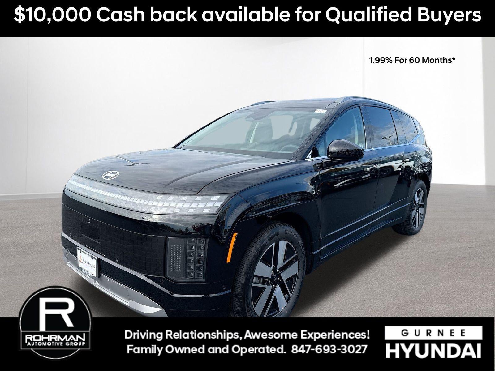 **ALL WHEEL DRIVE**, **NAVIGATION**, **LEATHER SEATS**, **PUSH BUTTON START**, **KEYLESS ENTRY**, **BACKUP CAMERA**, **Bluetooth®**, **HEATED STEERING WHEEL**, **REMOTE START**, **BLIND SPOT MONITOR**, **APPLE CARPLAY/ANDROID AUTO**, **ADAPTIVE CRUISE CONTROL**, PORTABLE AUDIO CONNECTION/MP3, Navigation System, Option Group 01. $10,334 off MSRP! Priced below KBB Fair Purchase Price! With options like Option Group 01, Navigation System, 20 x 8J Alloy Wheels, 4-Wheel Disc Brakes, 8 Speakers, ABS brakes, Air Conditioning, Alloy wheels, AM/FM radio: SiriusXM, Apple CarPlay & Android Auto, Auto High-beam Headlights, Auto-dimming Rear-View mirror, Auto-leveling suspension, Automatic temperature control, Bodyside moldings, Brake assist, Bumpers: body-color, Cargo Net, Cargo Tray, Delay-off headlights, Driver door bin, Driver vanity mirror, Dual front impact airbags, Dual front side impact airbags, Electronic Stability Control, Four wheel independent suspension, Front anti-roll bar, Front Bucket Seats, Front Center Armrest, Front dual zone A/C, Front reading lights, Fully automatic headlights, Garage door transmitter: HomeLink, H-Tex Leatherette Seating Surfaces, harman/kardon® Speakers, Heated door mirrors, Heated front seats, Heated rear seats, Heated steering wheel, Illuminated entry, Leather steering wheel, Low tire pressure warning, Occupant sensing airbag, Outside temperature display, Overhead airbag, Overhead console, Panic alarm, Passenger door bin, Passenger vanity mirror, Power door mirrors, Power driver seat, Power Liftgate, Power passenger seat, Power steering, Power windows, Radio: AM/FM/SiriusXM/HD Audio System, Rain sensing wipers, Rear air conditioning, Rear anti-roll bar, Rear reading lights, Rear seat center armrest, Rear side impact airbag, Rear window defroster, Rear window wiper, Reclining 3rd row seat, Remote keyless entry, Security system, Speed control, Split folding rear seat, Spoiler, Steering wheel mounted audio controls, Telescoping steering wheel, Tilt steering wheel, Traction control, Trip computer, Turn signal indicator mirrors, Variably intermittent wipers, and Ventilated front seats. Abyss Black 2026 Hyundai IONIQ 9 SEL AWD 1-Speed Automatic Electric Motor