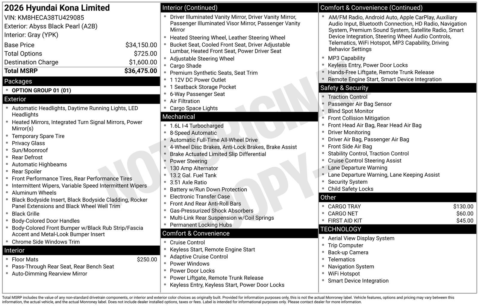 **SUNROOF/MOONROOF**, **NAVIGATION**, **LEATHER SEATS**, **PUSH BUTTON START**, **KEYLESS ENTRY**, **BACKUP CAMERA**, **Bluetooth®**, **HEATED STEERING WHEEL**, **POWER LIFTGATE**, **REMOTE START**, **BLIND SPOT MONITOR**, **APPLE CARPLAY/ANDROID AUTO**, **ADAPTIVE CRUISE CONTROL**, PORTABLE AUDIO CONNECTION/MP3, **BOSE PREMIUM AUDIO**, Navigation System, Option Group 01. $1,983 off MSRP! With options like Option Group 01, Navigation System, 4-Wheel Disc Brakes, 8 Speakers, ABS brakes, Air Conditioning, All-Weather Fitted Liners, Alloy wheels, AM/FM radio: SiriusXM, Apple CarPlay & Android Auto, Auto High-beam Headlights, Auto-dimming Rear-View mirror, Automatic temperature control, Brake assist, Bumpers: body-color, Cargo Net, Cargo Tray, Carpeted Floor Mats, Delay-off headlights, Driver door bin, Driver vanity mirror, Dual front impact airbags, Dual front side impact airbags, Electronic Stability Control, Emergency communication system: None, First Aid Kit, Four wheel independent suspension, Front anti-roll bar, Front Bucket Seats, Front Center Armrest, Front dual zone A/C, Front reading lights, Fully automatic headlights, H-Tex Seat Trim, Heated and Ventilated Front Bucket Seats, Heated door mirrors, Heated front seats, Heated steering wheel, Illuminated entry, Leather steering wheel, Low tire pressure warning, Occupant sensing airbag, Outside temperature display, Overhead airbag, Panic alarm, Passenger door bin, Passenger vanity mirror, Power door mirrors, Power driver seat, Power Liftgate, Power moonroof, Power steering, Power windows, Radio: AM/FM/SiriusXM/HD Audio System, Rear anti-roll bar, Rear seat center armrest, Rear window defroster, Rear window wiper, Remote keyless entry, Security system, Speed control, Speed-sensing steering, Split folding rear seat, Spoiler, Steering wheel mounted audio controls, Tachometer, Telescoping steering wheel, Tilt steering wheel, Traction control, Trip computer, Turn signal indicator mirrors, Variably intermittent wipers, Ventilated front seats, and Wheels: 19 x 7.5J Silver/Black Alloy. Abyss Black Pearl 2026 Hyundai Kona Limited AWD 8-Speed Automatic I4