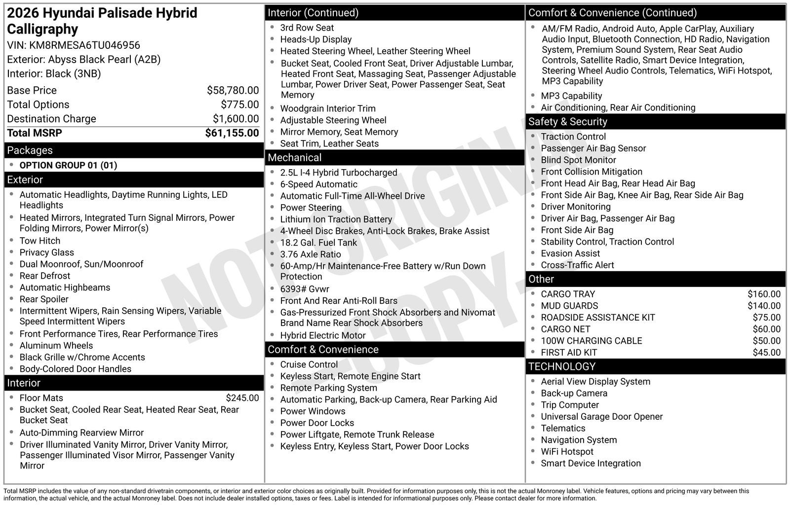 **ALL WHEEL DRIVE**, **SUNROOF/MOONROOF**, ** 7 PASSENGER**, **NAVIGATION**, **LEATHER SEATS**, **3RD ROW SEATS**, **PUSH BUTTON START**, **KEYLESS ENTRY**, **BACKUP CAMERA**, **Bluetooth®**, **HEATED STEERING WHEEL**, **RAIN SENSING WIPERS!**, **POWER LIFTGATE**, **REMOTE START**, **BLIND SPOT MONITOR**, **APPLE CARPLAY/ANDROID AUTO**, **ADAPTIVE CRUISE CONTROL**, PORTABLE AUDIO CONNECTION/MP3, **BOSE PREMIUM AUDIO**. $1,277 off MSRP! With options like Option Group 01, 100W Charging Cable, 14 Speakers, 3rd row seats: split-bench, 4-Wheel Disc Brakes, ABS brakes, Air Conditioning, Alloy wheels, AM/FM radio: SiriusXM, Apple CarPlay & Android Auto, Audio memory, Auto High-beam Headlights, Auto-dimming door mirrors, Auto-dimming Rear-View mirror, Auto-leveling suspension, Automatic temperature control, Brake assist, Bumpers: body-color, Cargo Net, Cargo Tray, Carpeted Floor Mats, Compass, Delay-off headlights, Driver door bin, Driver vanity mirror, Dual front impact airbags, Dual front side impact airbags, Electronic Stability Control, Emergency communication system: None, Exterior Parking Camera Rear, First Aid Kit, Four wheel independent suspension, Front anti-roll bar, Front Bucket Seats, Front Center Armrest, Front dual zone A/C, Front reading lights, Fully automatic headlights, Garage door transmitter: HomeLink, Genuine wood console insert, Genuine wood dashboard insert, Heads-Up Display, Heated and Ventilated Front Bucket Seats, Heated door mirrors, Heated front seats, Heated rear seats, Heated steering wheel, HVAC memory, Illuminated entry, Knee airbag, Leather steering wheel, Low tire pressure warning, Memory seat, Mud Guards, Navigation System, Occupant sensing airbag, Outside temperature display, Overhead airbag, Overhead console, Panic alarm, Passenger door bin, Passenger vanity mirror, Power door mirrors, Power driver seat, Power Liftgate, Power moonroof, Power passenger seat, Power steering, Power windows, Premium Nappa Leather Seat Trim, Radio data system, Radio: Infotainment Navigation System, Rain sensing wipers, Rear air conditioning, Rear anti-roll bar, Rear audio controls, Rear reading lights, Rear side impact airbag, Rear window defroster, Rear window wiper, Reclining 3rd row seat, Remote keyless entry, Roadside Assistance Kit, Security system, Side Steps, Speed control, Split folding rear seat, Spoiler, Steering wheel mounted audio controls, Tachometer, Telescoping steering wheel, Tilt steering wheel, Traction control, Trip computer, Turn signal indicator mirrors, Variably intermittent wipers, Ventilated front seats, Ventilated rear seats, and Wheels: 21 x 8.5J Alloy. Abyss Black Pearl 2026 Hyundai Palisade Hybrid Calligraphy AWD 6-Speed Automatic 2.5L Turbocharged GDI 4-Cylinder Hybrid