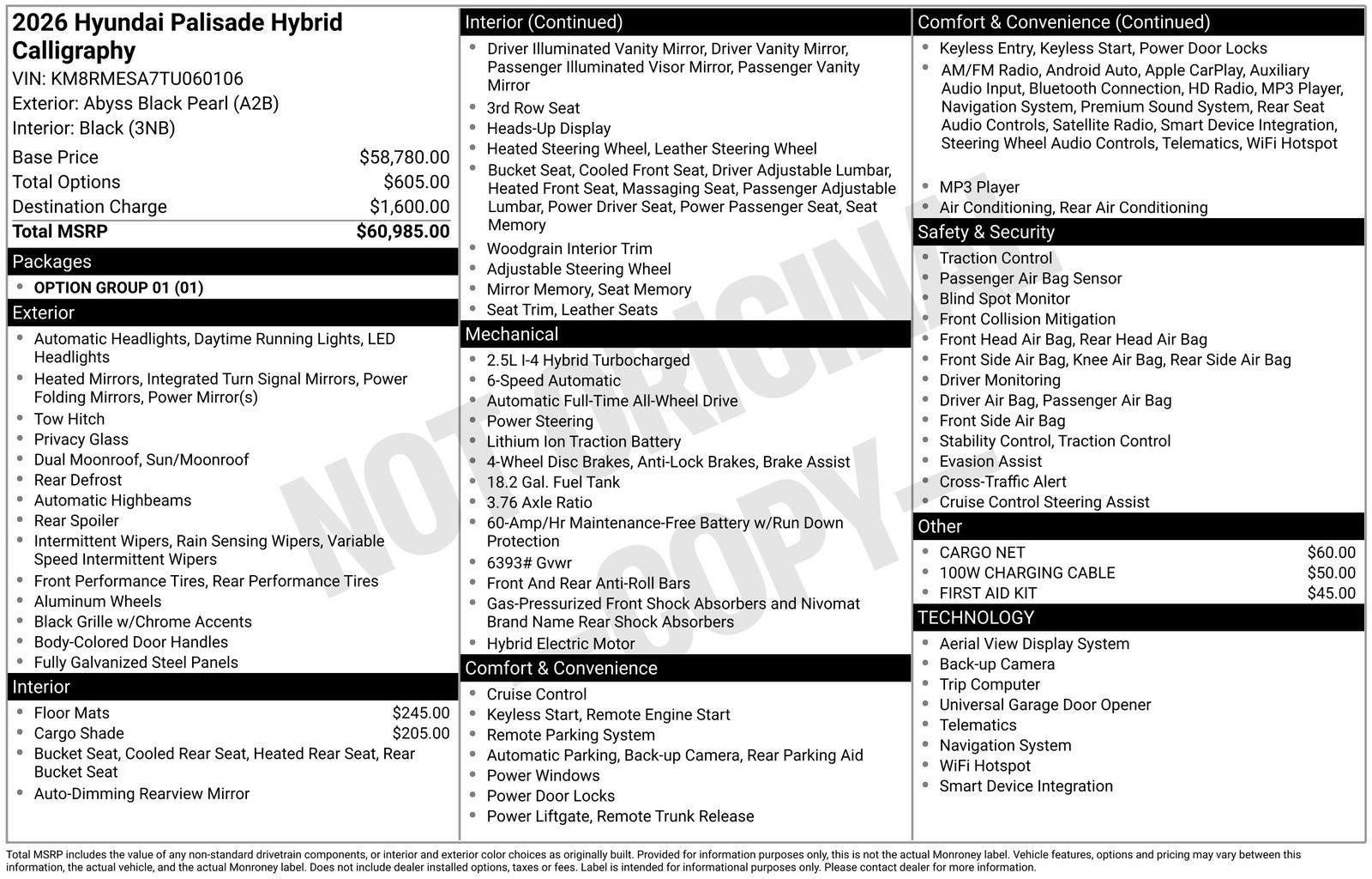 **ALL WHEEL DRIVE**, **SUNROOF/MOONROOF**, ** 7 PASSENGER**, **NAVIGATION**, **LEATHER SEATS**, **3RD ROW SEATS**, **PUSH BUTTON START**, **KEYLESS ENTRY**, **BACKUP CAMERA**, **Bluetooth®**, **HEATED STEERING WHEEL**, **RAIN SENSING WIPERS!**, **POWER LIFTGATE**, **REMOTE START**, **BLIND SPOT MONITOR**, **APPLE CARPLAY/ANDROID AUTO**, **ADAPTIVE CRUISE CONTROL**, PORTABLE AUDIO CONNECTION/MP3, **BOSE PREMIUM AUDIO**, Navigation System, Option Group 01. $1,757 off MSRP! With options like Option Group 01, Navigation System, 100W Charging Cable, 14 Speakers, 3rd row seats: split-bench, 4-Wheel Disc Brakes, ABS brakes, Air Conditioning, Alloy wheels, AM/FM radio: SiriusXM, Apple CarPlay & Android Auto, Audio memory, Auto High-beam Headlights, Auto-dimming door mirrors, Auto-dimming Rear-View mirror, Auto-leveling suspension, Automatic temperature control, Brake assist, Bumpers: body-color, Cargo Cover, Cargo Net, Carpeted Floor Mats, Compass, Delay-off headlights, Driver door bin, Driver vanity mirror, Dual front impact airbags, Dual front side impact airbags, Electronic Stability Control, Emergency communication system: None, Exterior Parking Camera Rear, First Aid Kit, Four wheel independent suspension, Front anti-roll bar, Front Bucket Seats, Front Center Armrest, Front dual zone A/C, Front reading lights, Fully automatic headlights, Garage door transmitter: HomeLink, Genuine wood console insert, Genuine wood dashboard insert, Heads-Up Display, Heated and Ventilated Front Bucket Seats, Heated door mirrors, Heated front seats, Heated rear seats, Heated steering wheel, HVAC memory, Illuminated entry, Knee airbag, Leather steering wheel, Low tire pressure warning, Memory seat, Occupant sensing airbag, Outside temperature display, Overhead airbag, Overhead console, Panic alarm, Passenger door bin, Passenger vanity mirror, Power door mirrors, Power driver seat, Power Liftgate, Power moonroof, Power passenger seat, Power steering, Power windows, Premium Nappa Leather Seat Trim, Radio data system, Radio: Infotainment Navigation System, Rain sensing wipers, Rear air conditioning, Rear anti-roll bar, Rear audio controls, Rear reading lights, Rear side impact airbag, Rear window defroster, Rear window wiper, Reclining 3rd row seat, Remote keyless entry, Security system, Speed control, Split folding rear seat, Spoiler, Steering wheel mounted audio controls, Tachometer, Telescoping steering wheel, Tilt steering wheel, Traction control, Trip computer, Turn signal indicator mirrors, Variably intermittent wipers, Ventilated front seats, Ventilated rear seats, and Wheels: 21 x 8.5J Alloy. Abyss Black Pearl 2026 Hyundai Palisade Hybrid Calligraphy AWD 6-Speed Automatic 2.5L Turbocharged GDI 4-Cylinder Hybrid