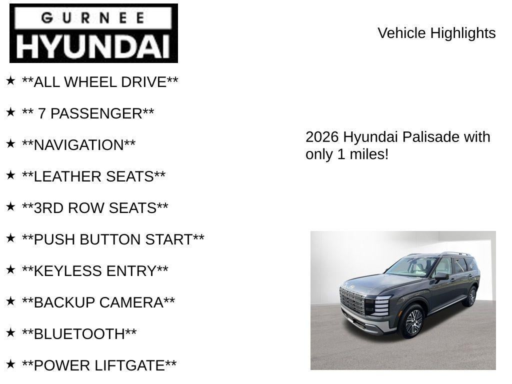 $1,668 off MSRP! With options like Option Group 01, 100W Charging Cable, 3rd row seats: split-bench, 4-Wheel Disc Brakes, 8 Speakers, ABS brakes, Air Conditioning, Alloy wheels, AM/FM radio: SiriusXM, Apple CarPlay & Android Auto, Auto High-beam Headlights, Auto-dimming Rear-View mirror, Auto-leveling suspension, Automatic temperature control, Brake assist, Bumpers: body-color, Cargo Cover, Cargo Net, Cargo Tray, Carpeted Floor Mats, Compass, Delay-off headlights, Driver door bin, Driver vanity mirror, Dual front impact airbags, Dual front side impact airbags, Electronic Stability Control, Emergency communication system: None, Exterior Parking Camera Rear, First Aid Kit, Four wheel independent suspension, Front anti-roll bar, Front Bucket Seats, Front Center Armrest, Front dual zone A/C, Front reading lights, Fully automatic headlights, H-Tex Leatherette Seat Trim, Heated door mirrors, Heated Front Bucket Seats, Heated front seats, Illuminated entry, Knee airbag, Leather steering wheel, Low tire pressure warning, Navigation System, Occupant sensing airbag, Outside temperature display, Overhead airbag, Overhead console, Panic alarm, Passenger door bin, Passenger vanity mirror, Power door mirrors, Power driver seat, Power Liftgate, Power steering, Power windows, Radio data system, Radio: Infotainment Navigation System, Rear air conditioning, Rear anti-roll bar, Rear audio controls, Rear reading lights, Rear side impact airbag, Rear window defroster, Rear window wiper, Reclining 3rd row seat, Remote keyless entry, Security system, Speed control, Split folding rear seat, Spoiler, Steering wheel mounted audio controls, Tachometer, Telescoping steering wheel, Tilt steering wheel, Traction control, Trip computer, Turn signal indicator mirrors, Variably intermittent wipers, and Wheels: 18 x 8.0J Alloy. Ecotronic Gray Pearl 2026 Hyundai Palisade Hybrid SEL 7 Passenger AWD 6-Speed Automatic 2.5L Turbocharged GDI 4-Cylinder Hybrid