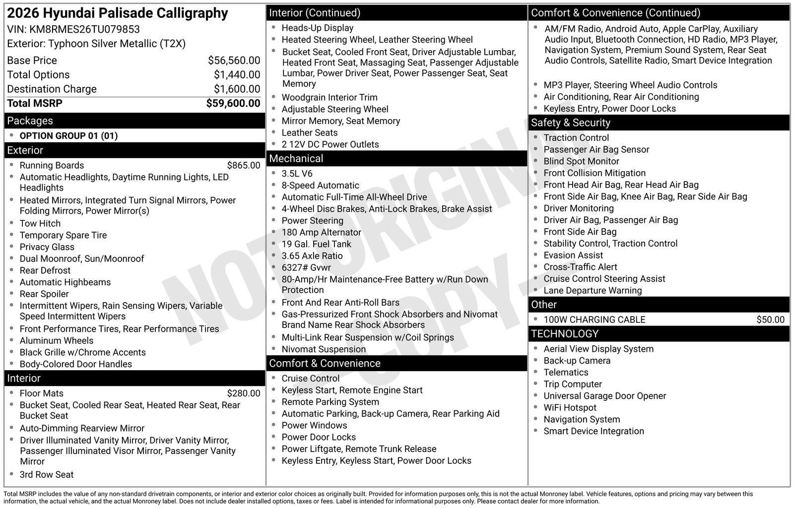 **ALL WHEEL DRIVE**, **SUNROOF/MOONROOF**, ** 7 PASSENGER**, **NAVIGATION**, **LEATHER SEATS**, **3RD ROW SEATS**, **PUSH BUTTON START**, **KEYLESS ENTRY**, **BACKUP CAMERA**, **Bluetooth®**, **HEATED STEERING WHEEL**, **RAIN SENSING WIPERS!**, **POWER LIFTGATE**, **REMOTE START**, **BLIND SPOT MONITOR**, **APPLE CARPLAY/ANDROID AUTO**, **ADAPTIVE CRUISE CONTROL**, PORTABLE AUDIO CONNECTION/MP3, **BOSE PREMIUM AUDIO**, Navigation System, Option Group 01. $4,921 off MSRP! Priced below KBB Fair Purchase Price! With options like Option Group 01, Navigation System, 100W Charging Cable, 14 Speakers, 3rd row seats: split-bench, 4-Wheel Disc Brakes, ABS brakes, Air Conditioning, All-Season Fitted Liners, Alloy wheels, AM/FM radio: SiriusXM, Apple CarPlay & Android Auto, Audio memory, Auto High-beam Headlights, Auto-dimming door mirrors, Auto-dimming Rear-View mirror, Auto-leveling suspension, Automatic temperature control, Brake assist, Bumpers: body-color, Carpeted Floor Mats, Compass, Delay-off headlights, Driver door bin, Driver vanity mirror, Dual front impact airbags, Dual front side impact airbags, Electronic Stability Control, Exterior Parking Camera Rear, Four wheel independent suspension, Front anti-roll bar, Front Bucket Seats, Front Center Armrest, Front dual zone A/C, Front reading lights, Fully automatic headlights, Garage door transmitter: HomeLink, Genuine wood console insert, Genuine wood dashboard insert, Heads-Up Display, Heated door mirrors, Heated front seats, Heated rear seats, Heated steering wheel, HVAC memory, Illuminated entry, Knee airbag, Leather steering wheel, Low tire pressure warning, Memory seat, Occupant sensing airbag, Outside temperature display, Overhead airbag, Overhead console, Panic alarm, Passenger door bin, Passenger vanity mirror, Power door mirrors, Power driver seat, Power Liftgate, Power moonroof, Power passenger seat, Power steering, Power windows, Premium Nappa Leather Seat Trim, Radio data system, Radio: Infotainment Navigation System, Rain sensing wipers, Rear air conditioning, Rear anti-roll bar, Rear audio controls, Rear reading lights, Rear side impact airbag, Rear window defroster, Rear window wiper, Reclining 3rd row seat, Remote keyless entry, Security system, Side Steps, Speed control, Split folding rear seat, Spoiler, Steering wheel mounted audio controls, Tachometer, Telescoping steering wheel, Tilt steering wheel, Traction control, Trip computer, Turn signal indicator mirrors, Variably intermittent wipers, Ventilated front seats, Ventilated rear seats, and Wheels: 21 x 8.5J Alloy. Typhoon Silver Metallic 2026 Hyundai Palisade Calligraphy AWD 8-Speed Automatic V6