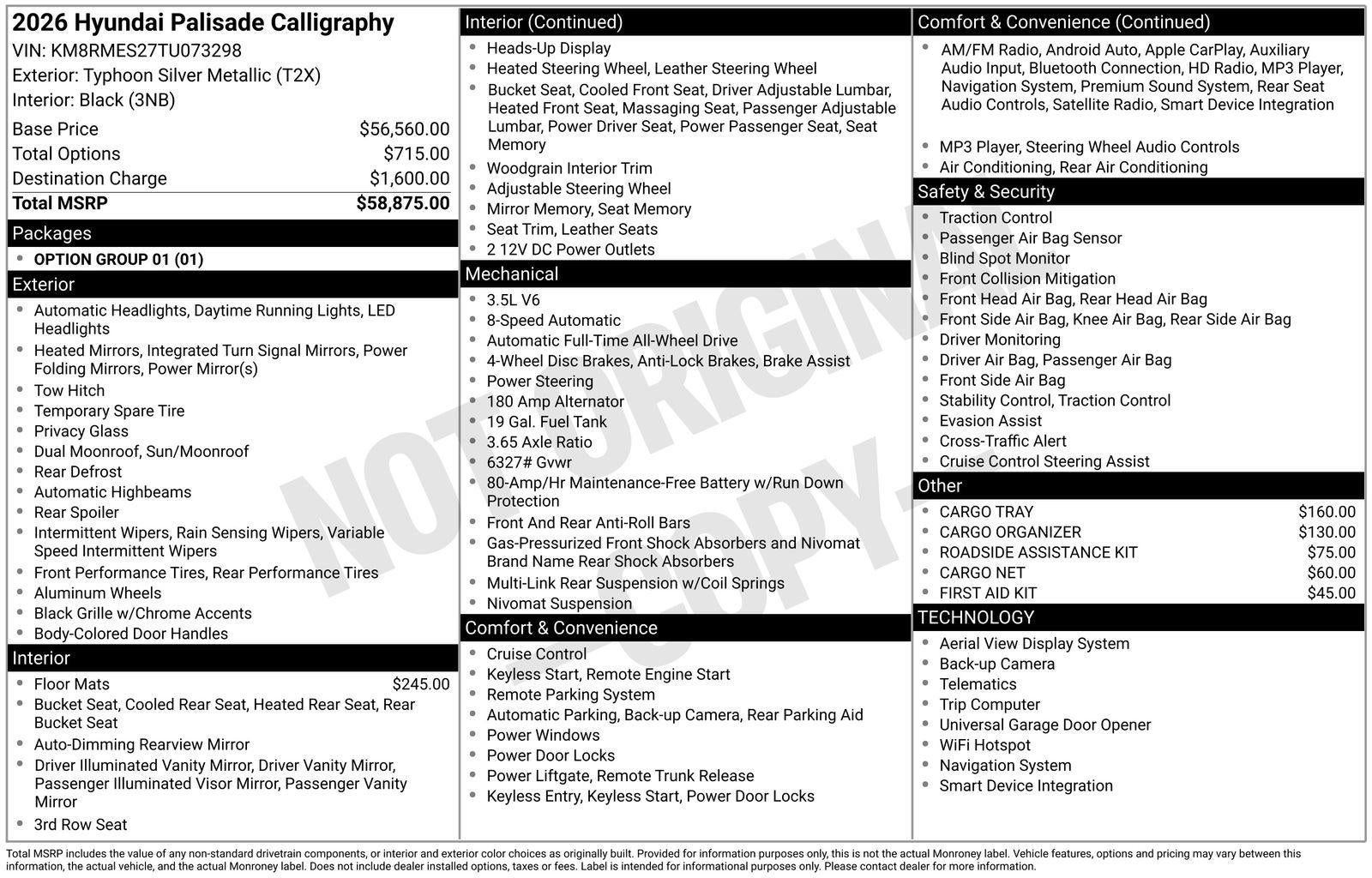 **ALL WHEEL DRIVE**, **SUNROOF/MOONROOF**, ** 7 PASSENGER**, **NAVIGATION**, **LEATHER SEATS**, **3RD ROW SEATS**, **PUSH BUTTON START**, **KEYLESS ENTRY**, **BACKUP CAMERA**, **Bluetooth®**, **HEATED STEERING WHEEL**, **RAIN SENSING WIPERS!**, **POWER LIFTGATE**, **REMOTE START**, **BLIND SPOT MONITOR**, **APPLE CARPLAY/ANDROID AUTO**, **ADAPTIVE CRUISE CONTROL**, PORTABLE AUDIO CONNECTION/MP3, Navigation System, Option Group 01. $4,886 off MSRP! Priced below KBB Fair Purchase Price! With options like Option Group 01, Navigation System, 14 Speakers, 3rd row seats: split-bench, 4-Wheel Disc Brakes, ABS brakes, Air Conditioning, Alloy wheels, AM/FM radio: SiriusXM, Apple CarPlay & Android Auto, Audio memory, Auto High-beam Headlights, Auto-dimming door mirrors, Auto-dimming Rear-View mirror, Auto-leveling suspension, Automatic temperature control, Brake assist, Bumpers: body-color, Cargo Net, Cargo Organizer, Cargo Tray, Carpeted Floor Mats, Compass, Delay-off headlights, Driver door bin, Driver vanity mirror, Dual front impact airbags, Dual front side impact airbags, Electronic Stability Control, Exterior Parking Camera Rear, First Aid Kit, Four wheel independent suspension, Front anti-roll bar, Front Bucket Seats, Front Center Armrest, Front dual zone A/C, Front reading lights, Fully automatic headlights, Garage door transmitter: HomeLink, Genuine wood console insert, Genuine wood dashboard insert, Heads-Up Display, Heated door mirrors, Heated front seats, Heated rear seats, Heated steering wheel, HVAC memory, Illuminated entry, Knee airbag, Leather steering wheel, Low tire pressure warning, Memory seat, Occupant sensing airbag, Outside temperature display, Overhead airbag, Overhead console, Panic alarm, Passenger door bin, Passenger vanity mirror, Power door mirrors, Power driver seat, Power Liftgate, Power moonroof, Power passenger seat, Power steering, Power windows, Premium Nappa Leather Seat Trim, Radio data system, Radio: Infotainment Navigation System, Rain sensing wipers, Rear air conditioning, Rear anti-roll bar, Rear audio controls, Rear reading lights, Rear side impact airbag, Rear window defroster, Rear window wiper, Reclining 3rd row seat, Remote keyless entry, Roadside Assistance Kit, Security system, Speed control, Split folding rear seat, Spoiler, Steering wheel mounted audio controls, Tachometer, Telescoping steering wheel, Tilt steering wheel, Traction control, Trip computer, Turn signal indicator mirrors, Variably intermittent wipers, Ventilated front seats, Ventilated rear seats, and Wheels: 21 x 8.5J Alloy. Typhoon Silver Metallic 2026 Hyundai Palisade Calligraphy AWD 8-Speed Automatic V6