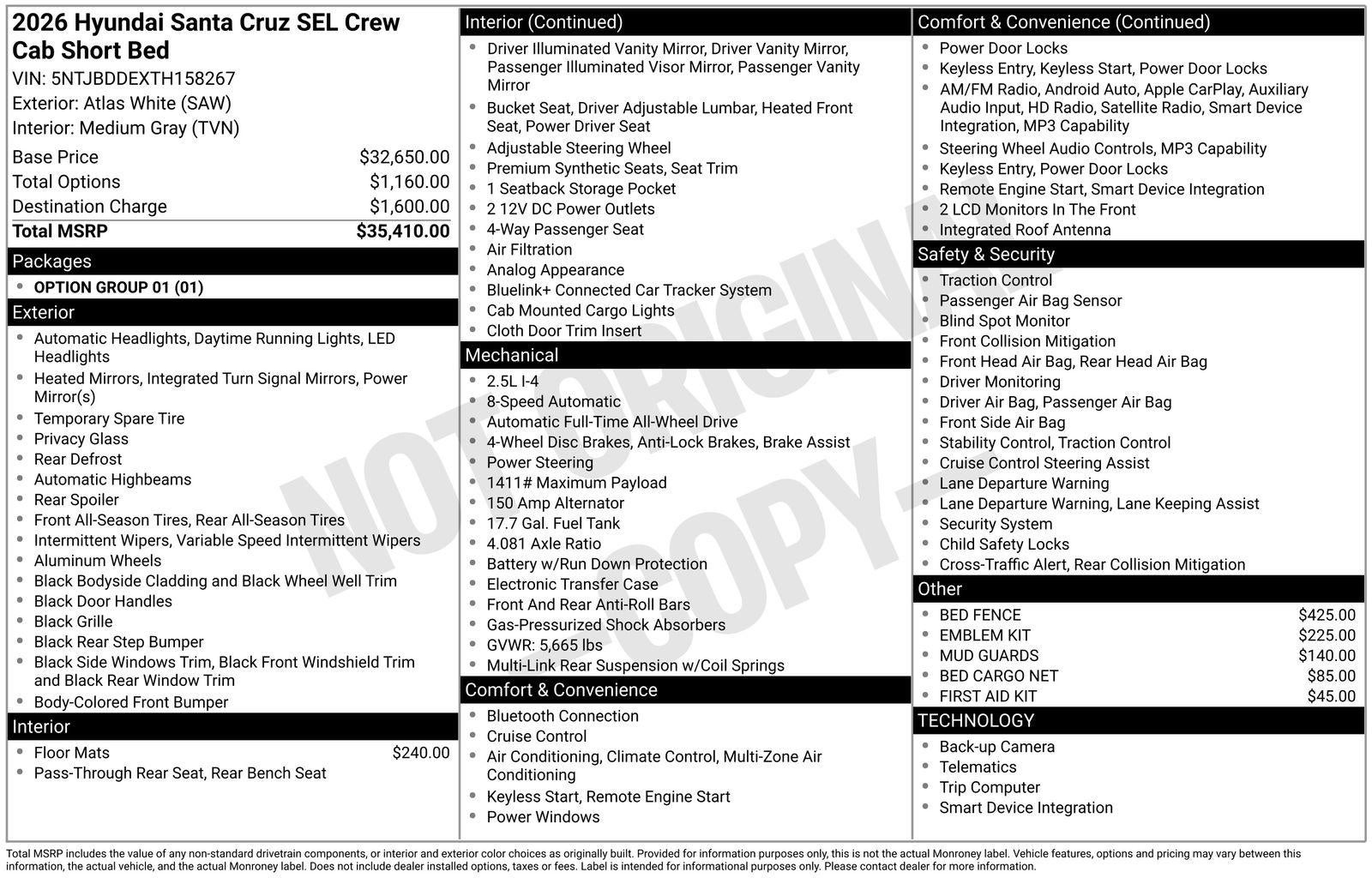 **ALL WHEEL DRIVE**, **LEATHER SEATS**, **PUSH BUTTON START**, **KEYLESS ENTRY**, **BACKUP CAMERA**, **Bluetooth®**, **REMOTE START**, **BLIND SPOT MONITOR**, **APPLE CARPLAY/ANDROID AUTO**, PORTABLE AUDIO CONNECTION/MP3, Option Group 01. $1,370 off MSRP! With options like Option Group 01, 18 x 7.5J Alloy Wheels, 4-Wheel Disc Brakes, 4.081 Axle Ratio, 6 Speakers, ABS brakes, Air Conditioning, Alloy wheels, AM/FM radio: SiriusXM, Apple CarPlay & Android Auto, Auto High-beam Headlights, Auto-leveling suspension, Automatic temperature control, Bed Cargo Net, Bed Fence, Brake assist, Bumpers: body-color, Cargo Net, Carpeted Floor Mats, Compass, Delay-off headlights, Driver door bin, Driver vanity mirror, Dual front impact airbags, Dual front side impact airbags, Electronic Stability Control, Emblem Kit, Exterior Parking Camera Rear, First Aid Kit, Four wheel independent suspension, Front anti-roll bar, Front Bucket Seats, Front Center Armrest, Front dual zone A/C, Front reading lights, Fully automatic headlights, H-Tex Leatherette Seat Trim, Heated door mirrors, Heated Front Bucket Seats, Heated front seats, Illuminated entry, Low tire pressure warning, Mud Guards, Occupant sensing airbag, Outside temperature display, Overhead airbag, Overhead console, Panic alarm, Passenger door bin, Passenger vanity mirror, Power door mirrors, Power driver seat, Power steering, Power windows, Radio data system, Radio: AM/FM/HD Audio System, Rear anti-roll bar, Rear reading lights, Rear side impact airbag, Rear step bumper, Rear window defroster, Remote keyless entry, Security system, Speed control, Speed-sensing steering, Split folding rear seat, Spoiler, Steering wheel mounted audio controls, Tachometer, Telescoping steering wheel, Tilt steering wheel, Traction control, Trip computer, Turn signal indicator mirrors, and Variably intermittent wipers. Atlas White 2026 Hyundai Santa Cruz SEL AWD 8-Speed Automatic with SHIFTRONIC 2.5L I4