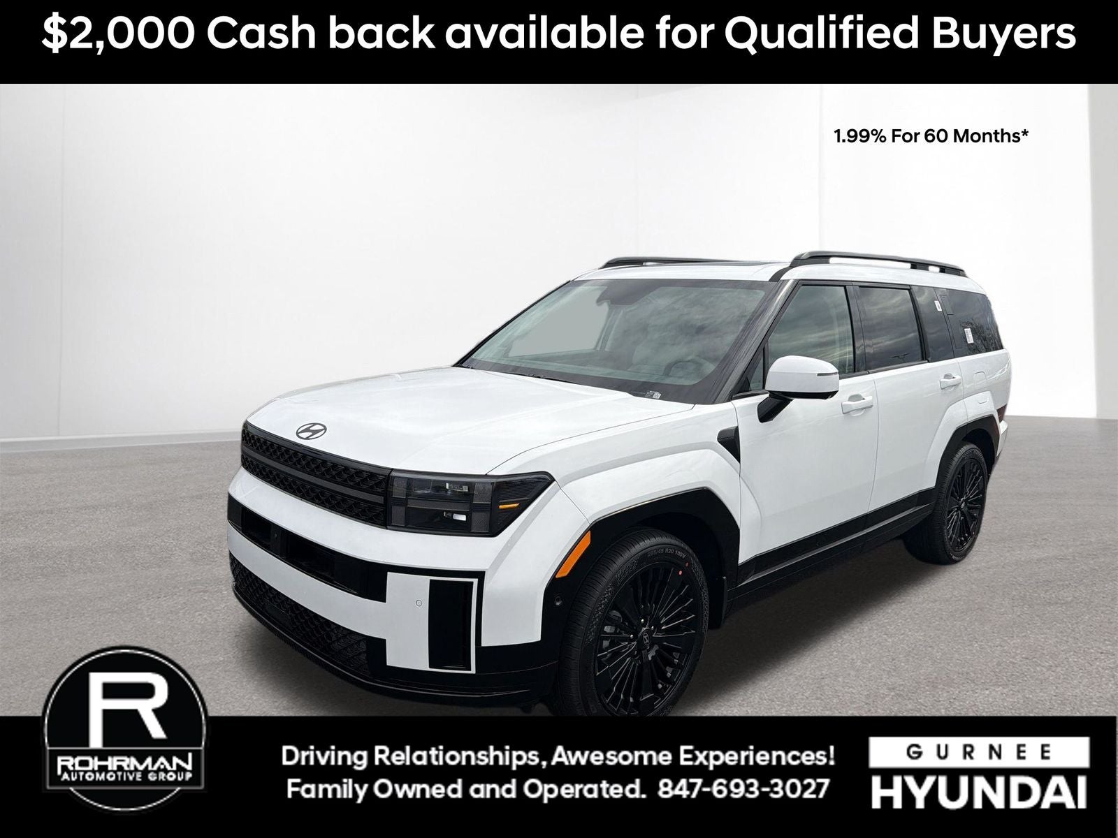 **ALL WHEEL DRIVE**, **SUNROOF/MOONROOF**, **NAVIGATION**, **LEATHER SEATS**, **3RD ROW SEATS**, **PUSH BUTTON START**, **KEYLESS ENTRY**, **BACKUP CAMERA**, **Bluetooth®**, **HEATED STEERING WHEEL**, **RAIN SENSING WIPERS!**, **POWER LIFTGATE**, **REMOTE START**, **BLIND SPOT MONITOR**, **APPLE CARPLAY/ANDROID AUTO**, **ADAPTIVE CRUISE CONTROL**, PORTABLE AUDIO CONNECTION/MP3, **BOSE PREMIUM AUDIO**, Navigation System, Option Group 01. $3,183 off MSRP! With options like Option Group 01, Navigation System, 12 Speakers, 3rd row seats: bench, 4-Wheel Disc Brakes, ABS brakes, Air Conditioning, Alloy wheels, AM/FM radio: SiriusXM, Apple CarPlay & Android Auto, Auto High-beam Headlights, Auto-dimming Rear-View mirror, Automatic temperature control, Brake assist, Bumpers: body-color, Cargo Cover/Screen, Cargo Net, Cargo Organizer, Cargo Tray, Carpeted Floor Mats, Delay-off headlights, Driver door bin, Driver vanity mirror, Dual front impact airbags, Dual front side impact airbags, Electronic Stability Control, Emergency communication system, Exterior Parking Camera Rear, First Aid Kit, Four wheel independent suspension, Front anti-roll bar, Front Bucket Seats, Front Center Armrest, Front dual zone A/C, Front reading lights, Fully automatic headlights, Garage door transmitter: HomeLink, Heads-Up Display, Heated and Ventilated Front Bucket Seats, Heated door mirrors, Heated front seats, Heated rear seats, Heated steering wheel, Illuminated entry, Knee airbag, Leather steering wheel, Low tire pressure warning, Memory seat, Mudguards, Occupant sensing airbag, Outside temperature display, Overhead airbag, Overhead console, Panic alarm, Passenger door bin, Passenger vanity mirror, Power door mirrors, Power driver seat, Power Liftgate, Power moonroof, Power passenger seat, Power steering, Power windows, Quilted Premium Nappa Leather Seat Trim, Radio: AM/FM/HD Bose Premium Audio System, Rain sensing wipers, Rear anti-roll bar, Rear side impact airbag, Rear window defroster, Rear window wiper, Remote keyless entry, Roadside Assistance Kit, Security system, Speed control, Speed-sensing steering, Split folding rear seat, Spoiler, Steering wheel mounted audio controls, Tachometer, Telescoping steering wheel, Tilt steering wheel, Traction control, Trip computer, Turn signal indicator mirrors, Variably intermittent wipers, Ventilated front seats, and Wheels: 20 x 8.5J Unique Dark Finish Alloy. Serenity White 2026 Hyundai Santa Fe Hybrid Calligraphy AWD 6-Speed Automatic with Shiftronic I4