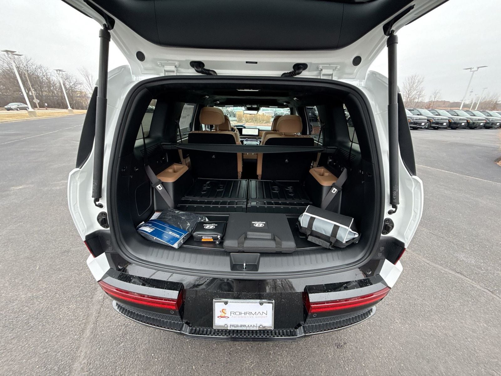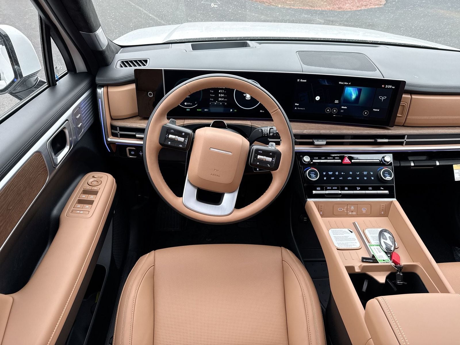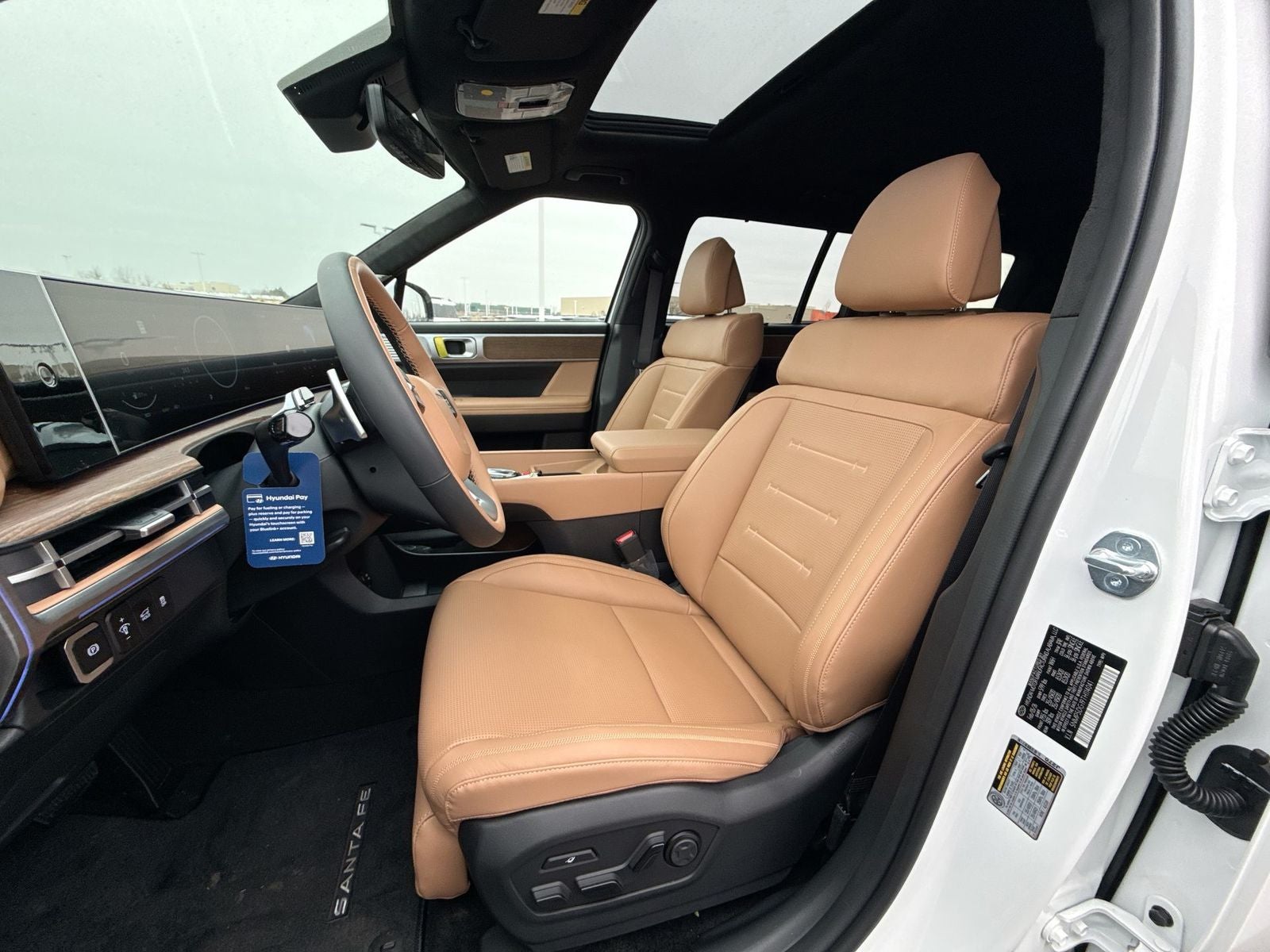 $5,170 off MSRP! Priced below KBB Fair Purchase Price! With options like Option Group 01, 12 Speakers, 3rd row seats: bench, 4-Wheel Disc Brakes, ABS brakes, Air Conditioning, Alloy wheels, AM/FM radio: SiriusXM, Apple CarPlay & Android Auto, Auto High-beam Headlights, Auto-dimming Rear-View mirror, Automatic temperature control, Brake assist, Bumpers: body-color, Cargo Cover/Screen, Cargo Net, Cargo Organizer, Cargo Tray, Carpeted Floor Mats, Delay-off headlights, Driver door bin, Driver vanity mirror, Dual front impact airbags, Dual front side impact airbags, Electronic Stability Control, Emergency communication system, Exterior Parking Camera Rear, First Aid Kit, Four wheel independent suspension, Front anti-roll bar, Front Bucket Seats, Front Center Armrest, Front dual zone A/C, Front reading lights, Fully automatic headlights, Garage door transmitter: HomeLink, Heads-Up Display, Heated and Ventilated Front Bucket Seats, Heated door mirrors, Heated front seats, Heated rear seats, Heated steering wheel, Illuminated entry, Knee airbag, Leather steering wheel, Low tire pressure warning, Memory seat, Navigation System, Occupant sensing airbag, Outside temperature display, Overhead airbag, Overhead console, Panic alarm, Passenger door bin, Passenger vanity mirror, Power door mirrors, Power driver seat, Power Liftgate, Power moonroof, Power passenger seat, Power steering, Power windows, Quilted Premium Nappa Leather Seat Trim, Radio: AM/FM/HD Bose Premium Audio System, Rain sensing wipers, Rear anti-roll bar, Rear side impact airbag, Rear window defroster, Rear window wiper, Remote keyless entry, Roadside Assistance Kit, Security system, Speed control, Speed-sensing steering, Split folding rear seat, Spoiler, Steering wheel mounted audio controls, Tachometer, Telescoping steering wheel, Tilt steering wheel, Traction control, Trip computer, Turn signal indicator mirrors, Variably intermittent wipers, Ventilated front seats, and Wheels: 20 x 8.5J Unique Dark Finish Alloy. Serenity White 2026 Hyundai Santa Fe Hybrid Calligraphy AWD 6-Speed Automatic with Shiftronic I4