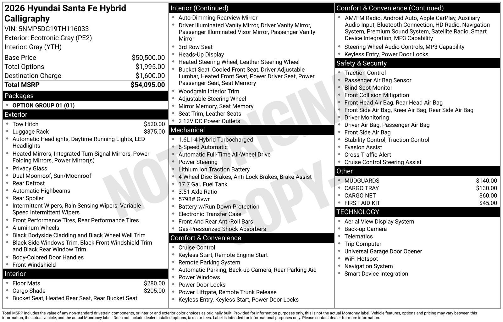 $5,369 off MSRP! With options like Option Group 01, 12 Speakers, 3rd row seats: bench, 4-Wheel Disc Brakes, ABS brakes, Air Conditioning, All Season Fitted Liners, Alloy wheels, AM/FM radio: SiriusXM, Apple CarPlay & Android Auto, Auto High-beam Headlights, Auto-dimming Rear-View mirror, Automatic temperature control, Brake assist, Bumpers: body-color, Cargo Cover/Screen, Cargo Net, Cargo Tray, Carpeted Floor Mats, Delay-off headlights, Driver door bin, Driver vanity mirror, Dual front impact airbags, Dual front side impact airbags, Electronic Stability Control, Emergency communication system, Exterior Parking Camera Rear, First Aid Kit, Four wheel independent suspension, Front anti-roll bar, Front Bucket Seats, Front Center Armrest, Front dual zone A/C, Front reading lights, Fully automatic headlights, Garage door transmitter: HomeLink, Heads-Up Display, Heated and Ventilated Front Bucket Seats, Heated door mirrors, Heated front seats, Heated rear seats, Heated steering wheel, Illuminated entry, Knee airbag, Leather steering wheel, Low tire pressure warning, Memory seat, Mudguards, Navigation System, Occupant sensing airbag, Outside temperature display, Overhead airbag, Overhead console, Panic alarm, Passenger door bin, Passenger vanity mirror, Power door mirrors, Power driver seat, Power Liftgate, Power moonroof, Power passenger seat, Power steering, Power windows, Quilted Premium Nappa Leather Seat Trim, Radio: AM/FM/HD Bose Premium Audio System, Rain sensing wipers, Rear anti-roll bar, Rear side impact airbag, Rear window defroster, Rear window wiper, Remote keyless entry, Roof Rack Crossbars, Security system, Speed control, Speed-sensing steering, Split folding rear seat, Spoiler, Steering wheel mounted audio controls, Tachometer, Telescoping steering wheel, Tilt steering wheel, Tow Hitch, Traction control, Trip computer, Turn signal indicator mirrors, Variably intermittent wipers, Ventilated front seats, and Wheels: 20 x 8.5J Unique Dark Finish Alloy. Ecotronic Gray 2026 Hyundai Santa Fe Hybrid Calligraphy AWD 6-Speed Automatic with Shiftronic I4