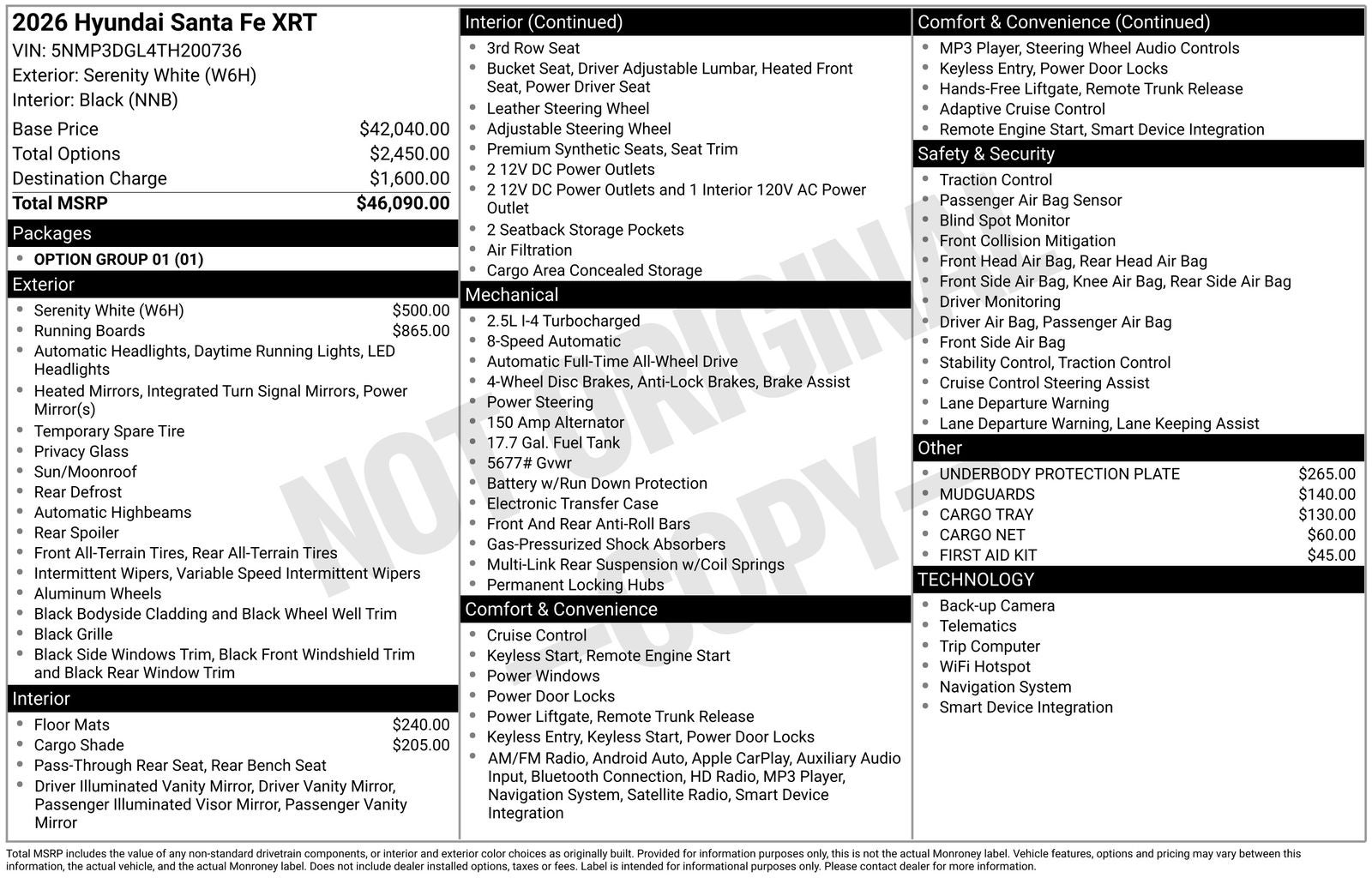$5,186 off MSRP! With options like Option Group 01, 3rd row seats: bench, 4-Wheel Disc Brakes, 6 Speakers, ABS brakes, Air Conditioning, Alloy wheels, AM/FM radio: SiriusXM, Apple CarPlay & Android Auto, Auto High-beam Headlights, Automatic temperature control, Brake assist, Bumpers: body-color, Cargo Cover/Screen, Cargo Net, Cargo Tray, Carpeted Floor Mats, Delay-off headlights, Driver door bin, Driver vanity mirror, Dual front impact airbags, Dual front side impact airbags, Electronic Stability Control, Emergency communication system, Exterior Parking Camera Rear, First Aid Kit, Four wheel independent suspension, Front anti-roll bar, Front Bucket Seats, Front Center Armrest, Front dual zone A/C, Front reading lights, Fully automatic headlights, H-Tex Leatherette Seat Trim, Heated door mirrors, Heated Front Bucket Seats, Heated front seats, Illuminated entry, Knee airbag, Leather steering wheel, Low tire pressure warning, Mudguards, Navigation System, Occupant sensing airbag, Outside temperature display, Overhead airbag, Overhead console, Panic alarm, Passenger door bin, Passenger vanity mirror, Power door mirrors, Power driver seat, Power Liftgate, Power moonroof, Power steering, Power windows, Radio: AM/FM/HD Display Audio, Rear anti-roll bar, Rear seat center armrest, Rear side impact airbag, Rear window defroster, Rear window wiper, Remote keyless entry, Security system, Side Steps, Speed control, Speed-sensing steering, Split folding rear seat, Spoiler, Steering wheel mounted audio controls, Tachometer, Telescoping steering wheel, Tilt steering wheel, Traction control, Trip computer, Turn signal indicator mirrors, Variably intermittent wipers, and Wheels: 18 x 7.5J Dark Alloy. Serenity White 2026 Hyundai Santa Fe XRT AWD 8-Speed Automatic with SHIFTRONIC 2.5L I4