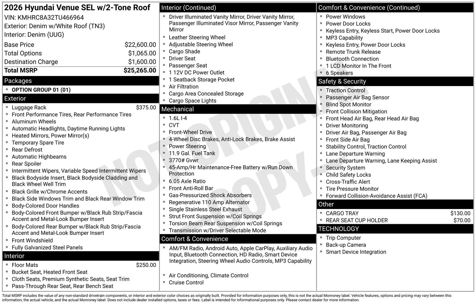 $1,006 off MSRP! With options like Option Group 01, 4-Wheel Disc Brakes, 6 Speakers, 6.5J x 17 Alloy Wheels, ABS brakes, Air Conditioning, All-Season Fitted Liners, Alloy wheels, AM/FM radio, Apple CarPlay & Android Auto, Auto High-beam Headlights, Automatic temperature control, Brake assist, Bumpers: body-color, Cargo Tray, Carpeted Floor Mats, Cross Rails, Delay-off headlights, Driver door bin, Driver vanity mirror, Dual front impact airbags, Dual front side impact airbags, Electronic Stability Control, Front anti-roll bar, Front Bucket Seats, Front Center Armrest, Front reading lights, Front wheel independent suspension, Fully automatic headlights, Heated door mirrors, Heated Front Bucket Seats, Heated front seats, Illuminated entry, Leather Shift Knob, Leather steering wheel, Low tire pressure warning, Occupant sensing airbag, Outside temperature display, Overhead airbag, Overhead console, Panic alarm, Passenger door bin, Passenger vanity mirror, Power door mirrors, Power steering, Power windows, Radio: AM/FM/HD Display Audio, Rear Seat Cup Holder, Rear window defroster, Rear window wiper, Remote keyless entry, Security system, Speed control, Speed-sensing steering, Split folding rear seat, Spoiler, Steering wheel mounted audio controls, Tachometer, Telescoping steering wheel, Tilt steering wheel, Traction control, Trip computer, and Variably intermittent wipers. Denim w/White Roof 2026 Hyundai Venue SEL FWD CVT I4
