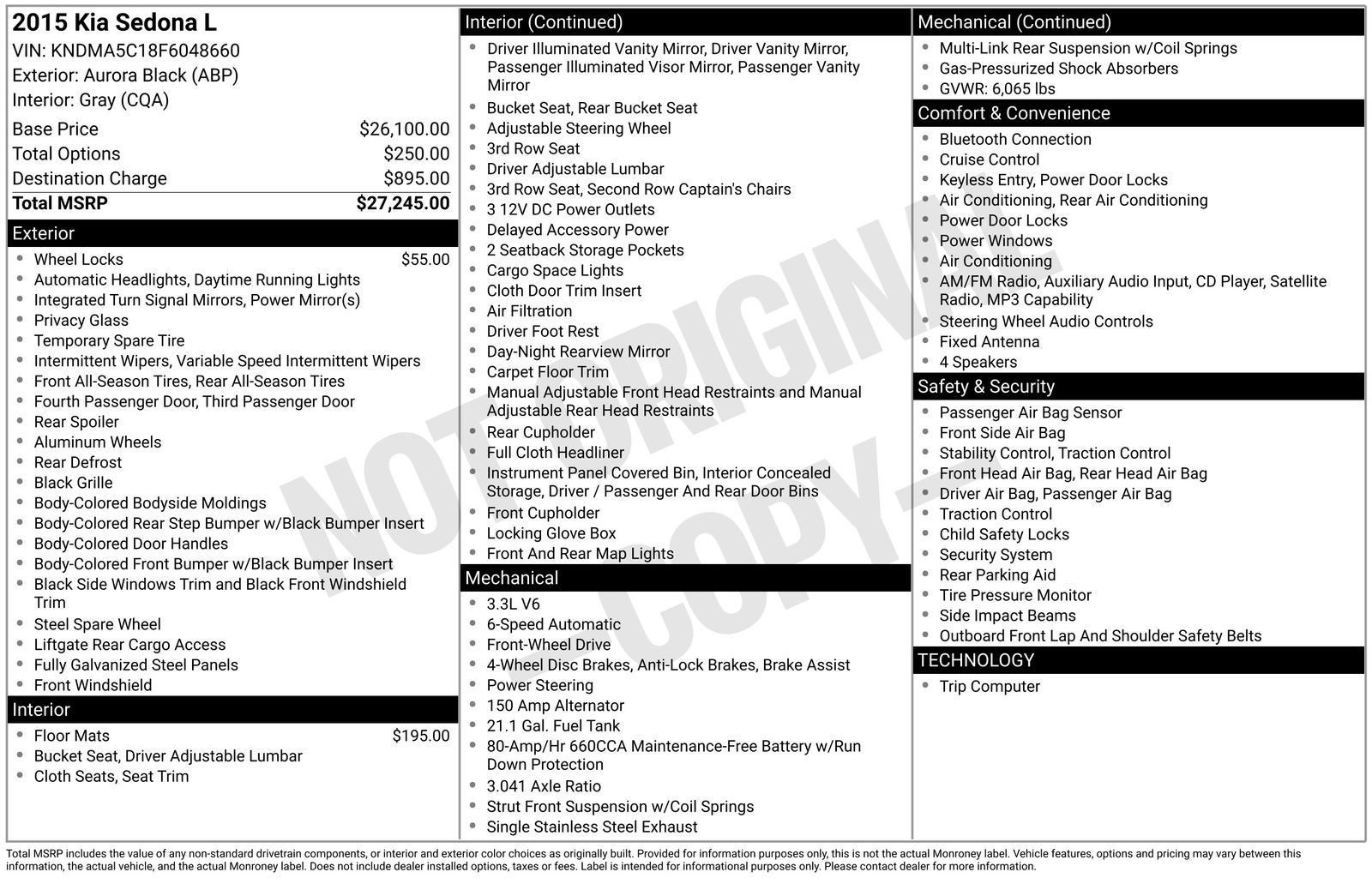 CARFAX One-Owner. 2015 Aurora Black Kia Sedona L FWD