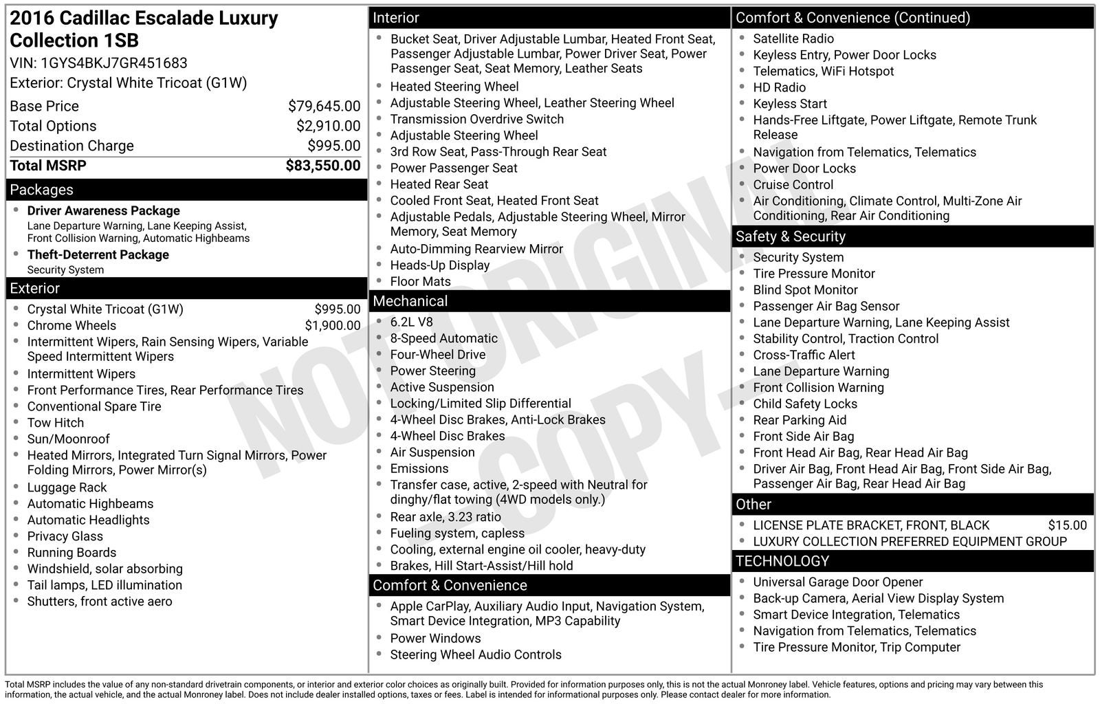 With options like Driver Awareness Package (Forward Collision Alert, IntelliBeam Headlamps, and Lane Keep Assist), Preferred Equipment Group 1SB (Power Tilt-Sliding Sunroof w/Express-Open/Close, Rear Cross-Traffic Alert, Reconfigurable 4-Color Head-Up Display, Second Row Bucket Seats, and Side Blind Zone Alert), Theft-Deterrent Package (Theft-Deterrent Alarm System, Vehicle Inclination Sensor, and Vehicle Interior Movement Sensor), 16 Speakers, 3.23 Axle Ratio, 3rd row seats: split-bench, 4-Wheel Disc Brakes, ABS brakes, Adaptive suspension, Adjustable pedals, Air Conditioning, Alloy wheels, AM/FM radio: SiriusXM, Apple CarPlay, Auto High-beam Headlights, Auto tilt-away steering wheel, Auto-dimming door mirrors, Auto-dimming Rear-View mirror, Auto-leveling suspension, Automatic temperature control, Black Front License Plate Bracket, Bodyside moldings, Bose Centerpoint Surround Sound System, Brake assist, Bumpers: body-color, CD player, Compass, Delay-off headlights, Driver door bin, Driver vanity mirror, Dual front impact airbags, Dual front side impact airbags, DVD-Audio, Electronic Stability Control, Emergency communication system: OnStar, Exterior Parking Camera Rear, Front anti-roll bar, Front Bucket Seats, Front Center Armrest w/Storage, Front dual zone A/C, Front reading lights, Front wheel independent suspension, Fully automatic headlights, Garage door transmitter, HD Radio, Heads-Up Display, Heated & Cooled Front Bucket Seats, Heated door mirrors, Heated front seats, Heated rear seats, Heated steering wheel, Illuminated entry, Lane Departure Warning System, Leather Seating Surfaces, Leather Shift Knob, Leather steering wheel, Low tire pressure warning, Magnetic Ride Control Suspension, Memory seat, Navigation System, NavTraffic, Occupant sensing airbag, Outside temperature display, Overhead airbag, Overhead console, Panic alarm, Passenger door bin, Passenger vanity mirror, Pedal memory, Power door mirrors, Power driver seat, Power Liftgate, Power moonroof, Power passenger seat, Power steering, Power windows, Radio data system, Radio: Cadillac CUE Info/Media Ctrl Sys w/Embd Nav, Rain sensing wipers, Rear air conditioning, Rear anti-roll bar, Rear audio controls, Rear reading lights, Rear window defroster, Rear window wiper, Remote keyless entry, Roof rack: rails only, Security system, Single Slot CD/MP3 Player, SiriusXM Satellite Radio, Speed control, Split folding rear seat, Spoiler, Steering wheel memory, Steering wheel mounted audio controls, Tachometer, Telescoping steering wheel, Tilt steering wheel, Traction control, Trip computer, Turn signal indicator mirrors, Variably intermittent wipers, Ventilated front seats, Wheels: 22 x 9 6-Spk Chrome Multi-Feature Design, and Wheels: 22 x 9 7-Spoke Aluminum.
