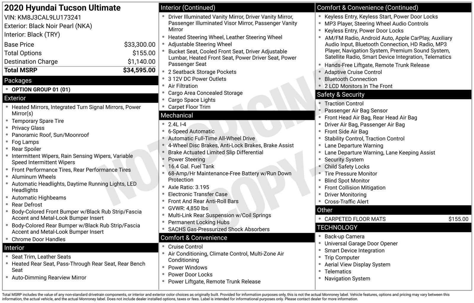 This online window sticker is provided for informational purposes only. Vehicle features, options, pricing and other information are subject to change. See your Hyundai dealer and the Monroney label affixed to the actual vehicle for the most up-to-date specifications and information.