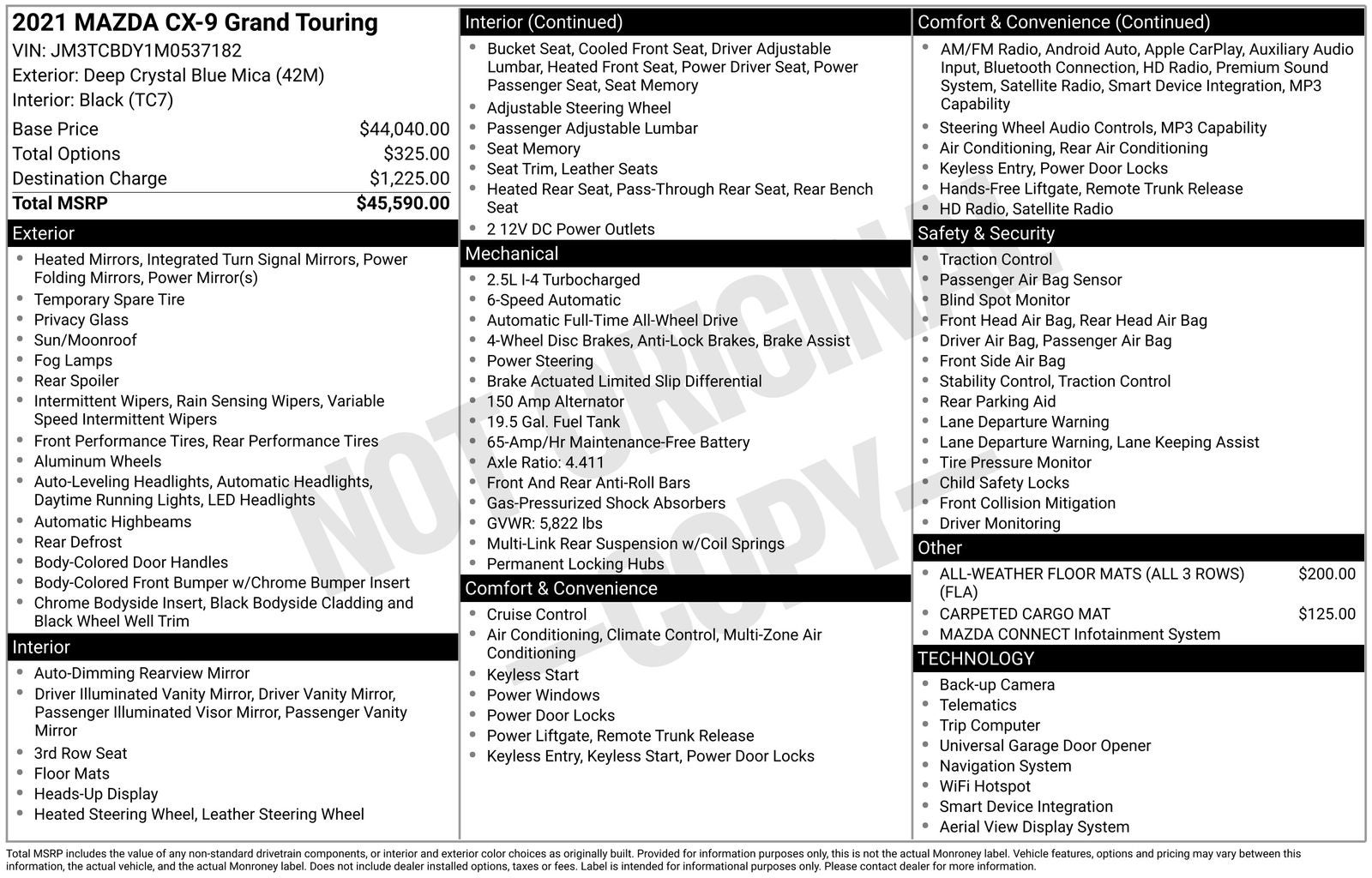 CARFAX One-Owner. **ALL WHEEL DRIVE**, **SUNROOF/MOONROOF**, **NAVIGATION**, **LEATHER SEATS**, **3RD ROW SEATS**, **PUSH BUTTON START**, **KEYLESS ENTRY**, **BACKUP CAMERA**, **Bluetooth®**, **HEATED STEERING WHEEL**, **RAIN SENSING WIPERS!**, **POWER LIFTGATE**, **BLIND SPOT MONITOR**, **APPLE CARPLAY/ANDROID AUTO**, PORTABLE AUDIO CONNECTION/MP3, **BOSE PREMIUM AUDIO**, Navigation System. 2021 Deep Crystal Blue Mica Mazda CX-9 Grand Touring AWD