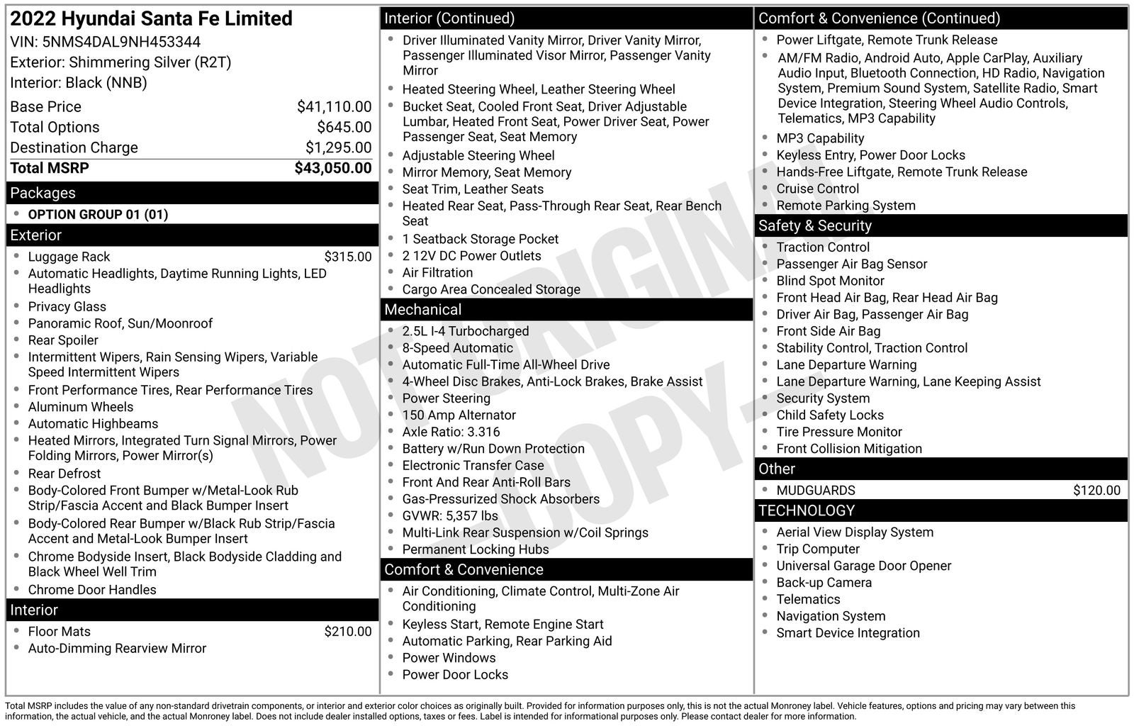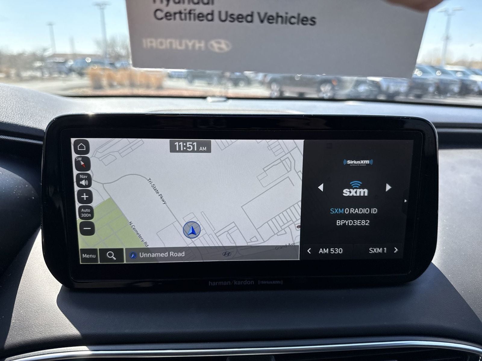 Clean CARFAX. CARFAX One-Owner. **STILL UNDER FACTORY WARRANTY**, *STILL UNDER FACTORY POWERTRAIN WARRANTY*, **ALL WHEEL DRIVE**, **PANORAMIC SUNROOF**, **NAVIGATION**, **LEATHER SEATS**, **PUSH BUTTON START**, **KEYLESS ENTRY**, **BACKUP CAMERA**, **Bluetooth®**, **HEATED STEERING WHEEL**, **RAIN SENSING WIPERS!**, **POWER LIFTGATE**, **REMOTE START**, **BLIND SPOT MONITOR**, **APPLE CARPLAY/ANDROID AUTO**, PORTABLE AUDIO CONNECTION/MP3, **HARMAN KARDON PREMIUM AUDIO**, Navigation System, Option Group 01. Priced below KBB Fair Purchase Price! 2022 Shimmering Silver Pearl Hyundai Certified. Santa Fe Limited AWD