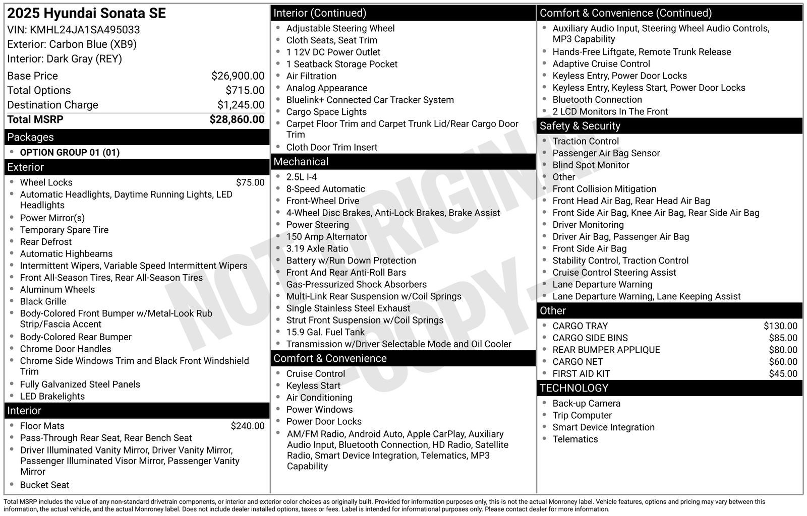 With options like Option Group 01, 16 x 6.5J Aluminum Alloy Wheels, 4-Wheel Disc Brakes, 6 Speakers, ABS brakes, Air Conditioning, Alloy wheels, AM/FM radio: SiriusXM, Apple CarPlay & Android Auto, Auto High-beam Headlights, Brake assist, Bumpers: body-color, Cargo Net, Cargo Side Bins, Cargo Tray, Carpeted Floor Mats, Cloth Seating Surfaces, Delay-off headlights, Driver door bin, Driver vanity mirror, Dual front impact airbags, Dual front side impact airbags, Electronic Stability Control, Emergency communication system: Bluelink+, Exterior Parking Camera Rear, First Aid Kit, Four wheel independent suspension, Front anti-roll bar, Front Bucket Seats, Front Center Armrest, Front reading lights, Fully automatic headlights, Illuminated entry, Knee airbag, Low tire pressure warning, Occupant sensing airbag, Outside temperature display, Overhead airbag, Overhead console, Panic alarm, Passenger door bin, Passenger vanity mirror, Power door mirrors, Power steering, Power windows, Radio data system, Radio: AM/FM/HD/SiriusXM, Rear anti-roll bar, Rear Bumper Applique, Rear side impact airbag, Rear window defroster, Remote keyless entry, Security system, Speed control, Speed-sensing steering, Speed-Sensitive Wipers, Split folding rear seat, Steering wheel mounted audio controls, Tachometer, Telescoping steering wheel, Tilt steering wheel, Traction control, Trip computer, Variably intermittent wipers, and Wheel Locks.