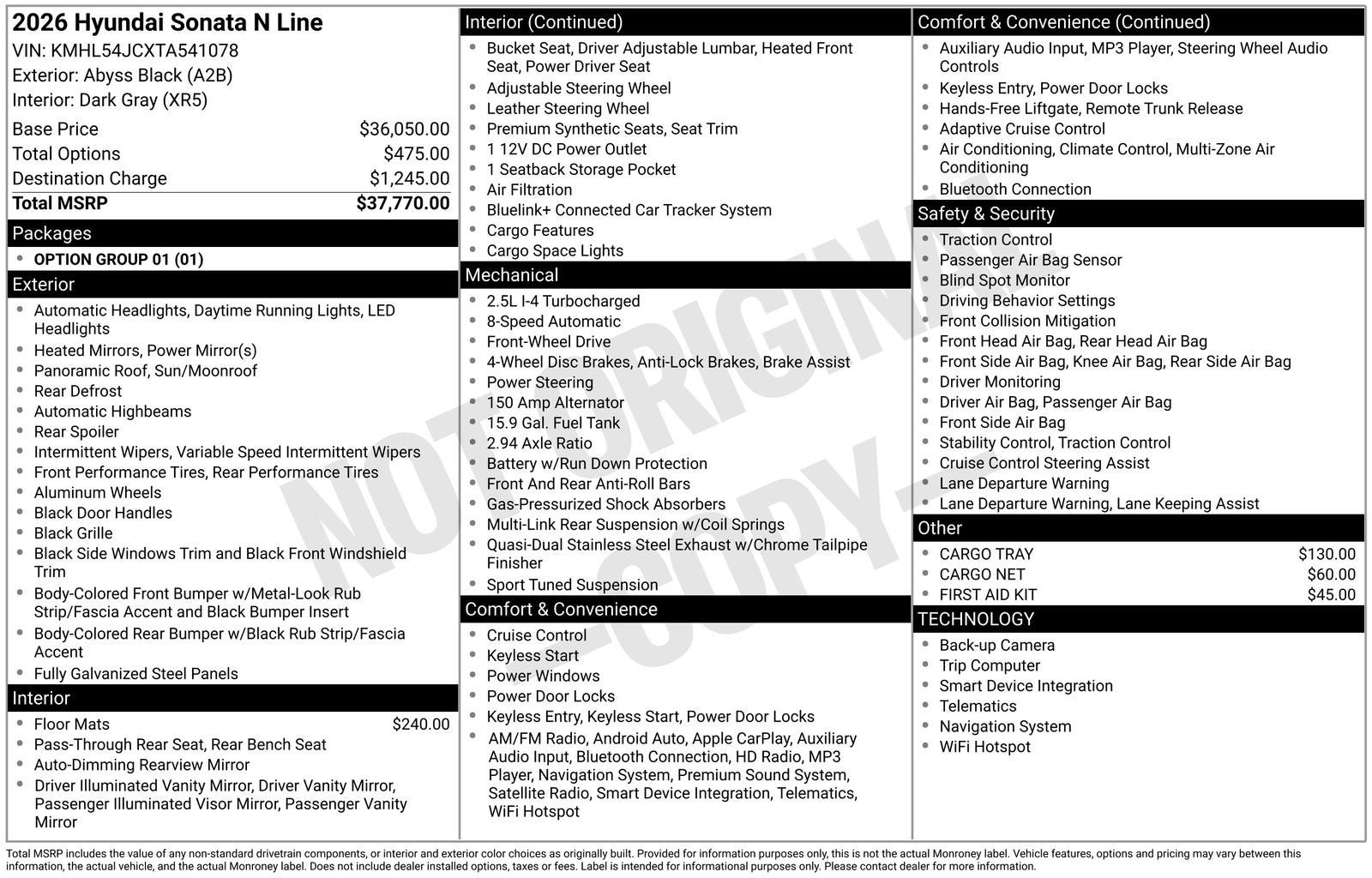 Clean CARFAX. **PANORAMIC SUNROOF**, **PUSH BUTTON START**, **KEYLESS ENTRY**, **BACKUP CAMERA**, **Bluetooth®**, **REMOTE START**, **BLIND SPOT MONITOR**, **APPLE CARPLAY/ANDROID AUTO**, **ADAPTIVE CRUISE CONTROL**, PORTABLE AUDIO CONNECTION/MP3, **BOSE PREMIUM AUDIO**, Navigation System, Option Group 01. Priced below KBB Fair Purchase Price! 2026 Abyss Black Hyundai Certified. Sonata N Line FWD